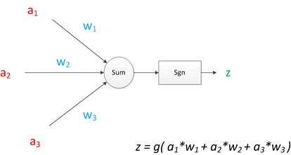 这个理论在今天看来不太靠谱,因为今天我们仍然为了深度学习对大脑的模拟而疯狂。但是当时却是另一幅光景。Warren McCulloch 和 Walter Pitts 在 1943年 提出的神经元的数学模型,更是给这个思路提供了理论依据。该模型认为,大脑的神经元的工作方式跟数字电路中的逻辑门是一样的。如图,就是一个多输入线性加权,然后通过一个符号函数输出 0 或 1。这个基本单元跟逻辑门是一样的。这个模型现在已经被广泛接受,我好像没看到过有人针对这个问题提出过有说服力的质疑。