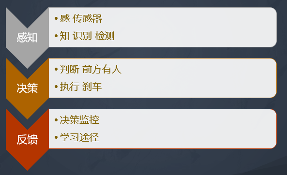 第三个层次是“反馈”。为什么反馈是一个独立的层次?反馈有两个重要的作用,一方面它是构成有执行能力的人工智能系统的重要独立环节。对于机器人系统来说,可以认为反馈就是执行机构的监控系统。无人驾驶的汽车执行刹车指令时,它需要反馈系统来传达刹车是否成功。另一方面,反馈也是学习的重要手段:通过学习,达到人工智能,或者说达到某种程度的智能,靠的就是反馈,这是它凌驾于感知和决策之上的原因。我们人脑学习所有知识也都是通过“预测 - 反馈”的路径进行的。走进房间,看到我这个人,你脑子里会先浮现出这个人的样子,然后再与你看到的验证。眼睛是眼睛,鼻子是鼻子,哦这是我认识的那个人。如果长眼睛的位置长了两个鼻子,那你一定会惊觉,然后你脑子里一些原本并不活跃的神经元开始变得活跃起来,开始学习遇到的新情况。我们脑子进行“预测 - 反馈”的频率比你能意识到的要多的多,多到无时不在进行,这与我们所感受到的和我们传统的概念不一样。我们的大脑通过感受到的事物与预测的模式之间的匹配来学习。我们靠预测去泛化,用反馈来收敛。这是人脑学习的原理,也是我们设计人工智能的重要方式。