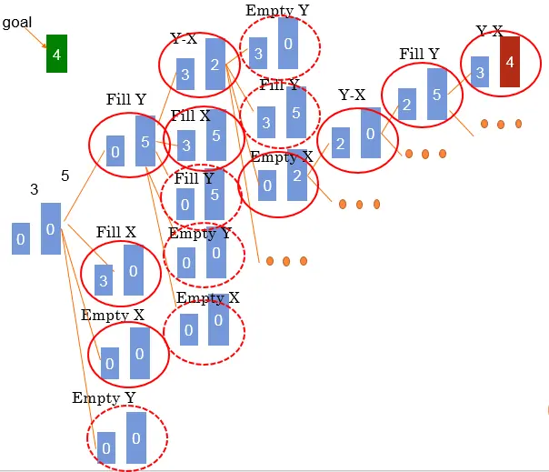 然后到了Fill X 这个状态机之后,又可以有其他5种状态,接着转起来,就这样不断的探索下去,我们举个最简单的例子,一桶容量是3斤的水和一桶容量是5斤的水,倒出4斤,看一下状态机的图: