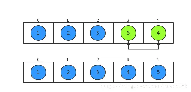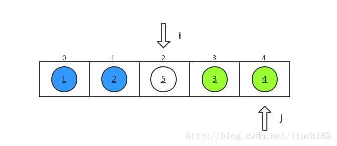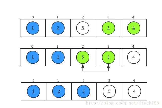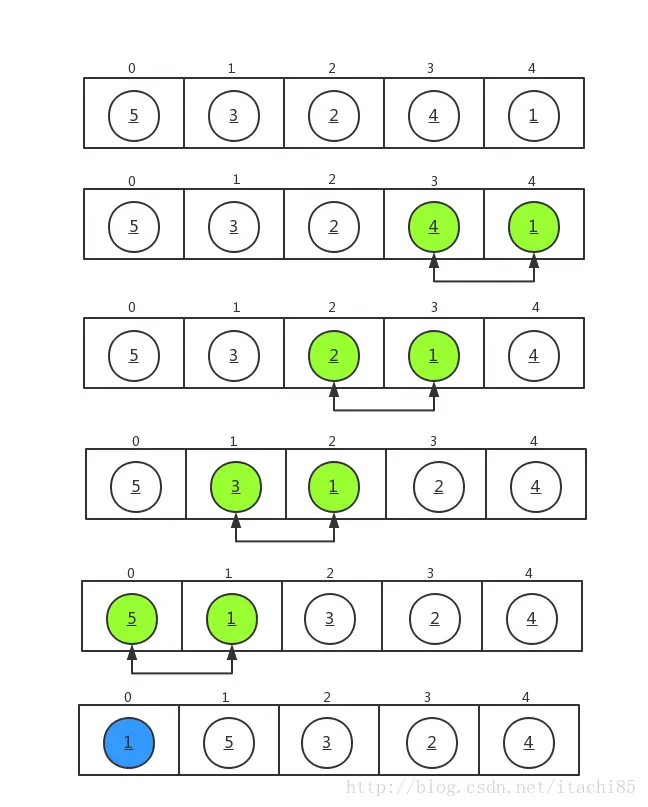 我们对数组 a={5,3,2,4,1} 进行从小到大排序,排序过程如下所示。