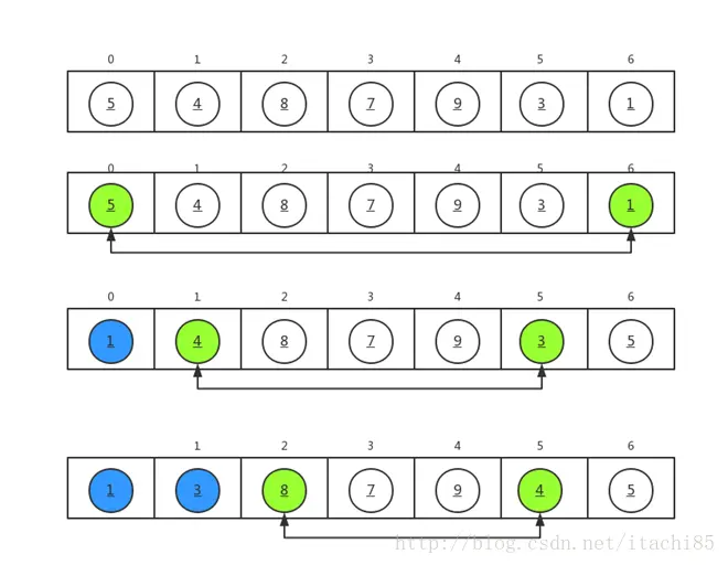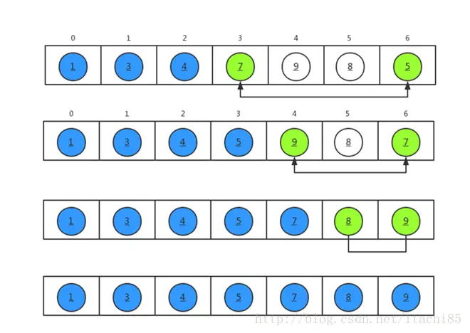 以数组a={5,4,8,7,9,3,1}为例,我们对其进行从小到大排序,排序过程如下图所示。
