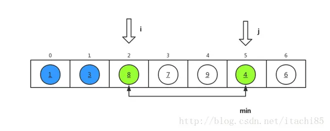 如上图所示,i为循环变量,代表未排序部分的开头元素; j为循环变量,用来遍历未排序部分找出最小值min。