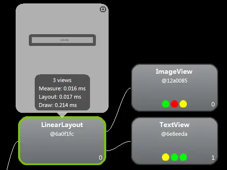 从图中可以看出,被选中的LinearLayout给出了自身Measure、Layout和Draw的耗时,并且它所包含的View中都有了三个指示灯,分别代表当前View在Measure、Layout和Draw的耗时,绿色代表比其他50%View的同阶段(比如Measure阶段)速度要快,黄色则代表比其他50%View同阶段速度要慢,红色则代表比其他View同阶段都要慢,则需要注意了。如果想要看View的具体耗时,则点击该View就可以了。