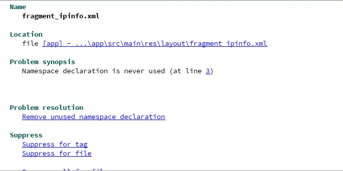 图中列出了项目中出现的问题种类,以及每个问题种类的个数,问题种类包括我们前面提到的Correctness 、Internationalization 、Performance等。我们点击展开最后的XML一项,点击一个问题,就会出现如下图的提示。