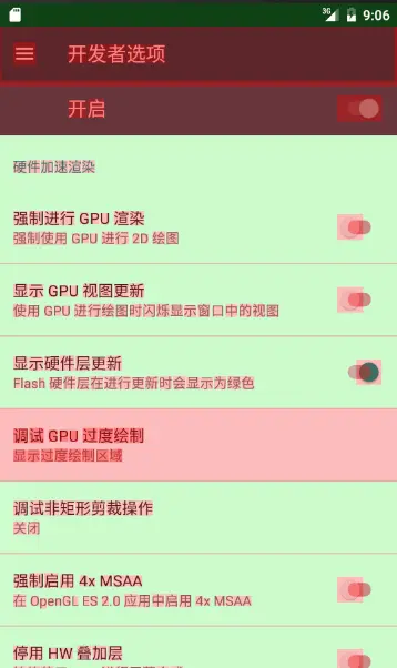 过度绘制是不可避免的,但是过多的过度绘制会浪费很多资源,并且导致性能问题,因此,避免过度绘制是十分必要的。我们可以用Android系统中自带的工具来检测过度绘制。首先要保证系统版本在Android 4.1以上,接着在开发者选项中打开调试GPU过度绘制选项就可以进入GPU过度绘制模式,如下图所示。