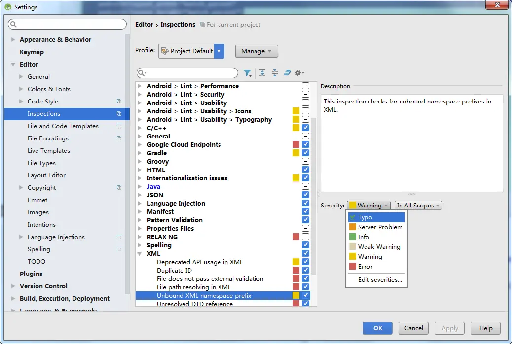 ...第三行的Namespace 确实没有被用到。如果想要自定义Android Lint的检查提示,可以通过File->Settings->Editor->Inspections中来配置Android Lint,如下图所示。