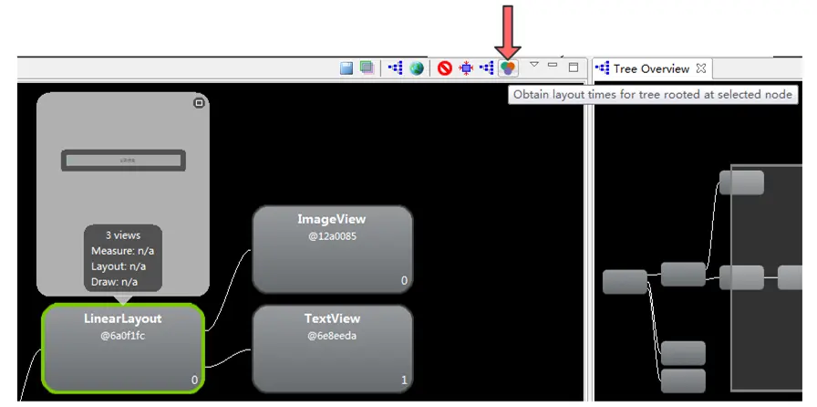 根据上面讲到的Hierarchy Viewer的4个四个子窗口,我们可以很容易的查看我们布局控件的层级关系。当然Hierarchy Viewer还可以查看某一个View的耗时,我们可以选择某一个View,然后单击下图红色箭头标识的按钮,这里我们把他简称为Layout Time按钮。