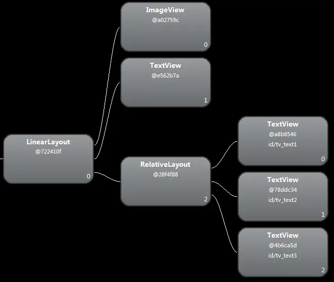 布局共有两层,一共含有4个View。从这里我们就可以看出我们用RelativeLayout减少了一层的布局,当然这只是一个简单例子,如果布局复杂,那么合理的用RelativeLayout来替代LinearLayout会减少很多层布局。