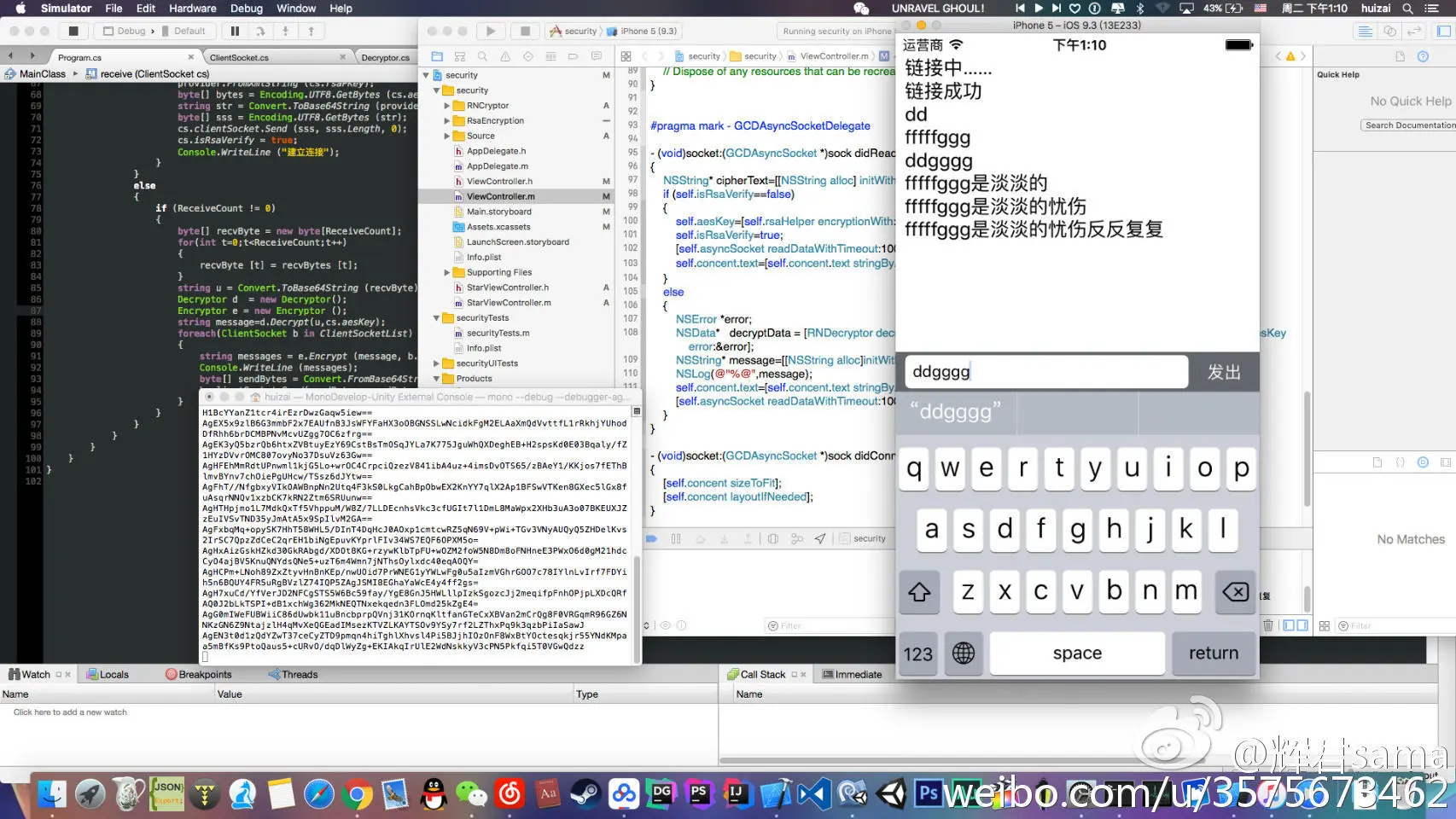 可以看到手机显示的和电脑端的模拟器同步并且传输的内容成功加密解密(控制台上输出的是密文)
