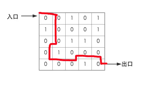 用一个二维数组表示一个简单的迷宫,用0表示通路,用1表示阻断,老鼠在每个点上可以移动相邻的东南西北四个点,设计一个算法,模拟老鼠走迷宫,找到从入口到出口的一条路径。