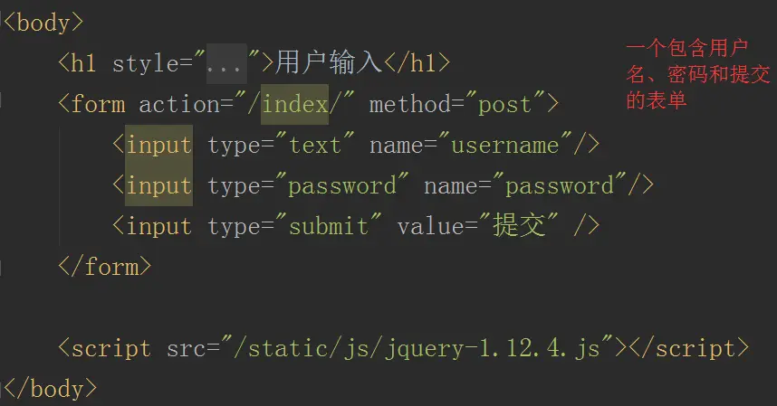 下面我们设计一个表单,让用户输入用户名和密码,提交给index这个url,服务器将接收到这些数据。