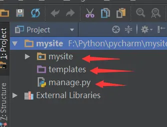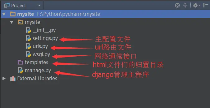 与项目同名的目录中是配置文件,templates目录是html文件存放也就是MTV中的T。manage.py是django项目管理文件。