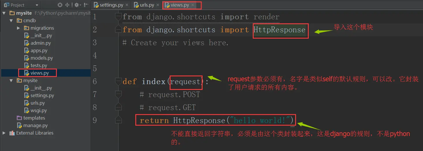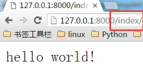通过上面两个步骤,我们将index这个url指向了views里的index()函数,它接收用户请求,并返回一个“hello world”字符串。