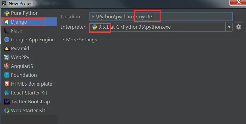 选择Django栏目,输入项目名称,这里采用国际惯例的mysite。选择python解释器版本,点击create创建。