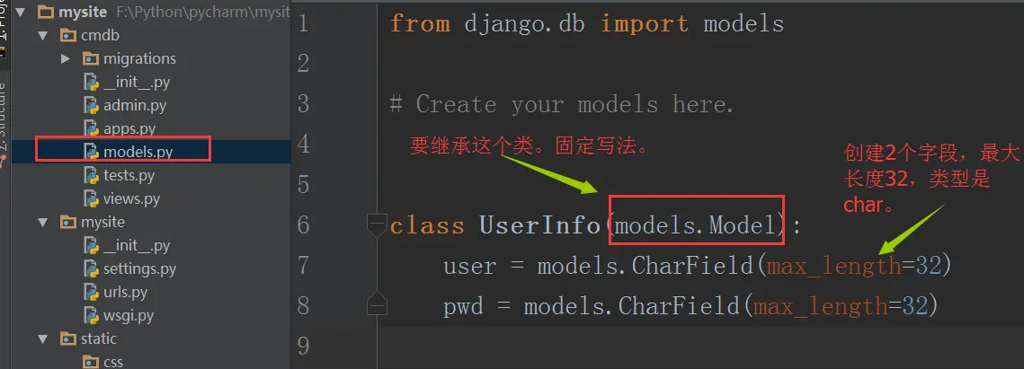再编辑models.py文件,也就是MTV中的M。
