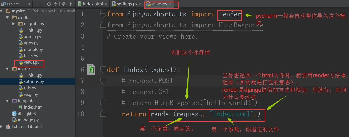 为了让django知道我们的html文件在哪里,需要修改settings文件的相应内容。但默认情况下,它正好适用,你无需修改。
