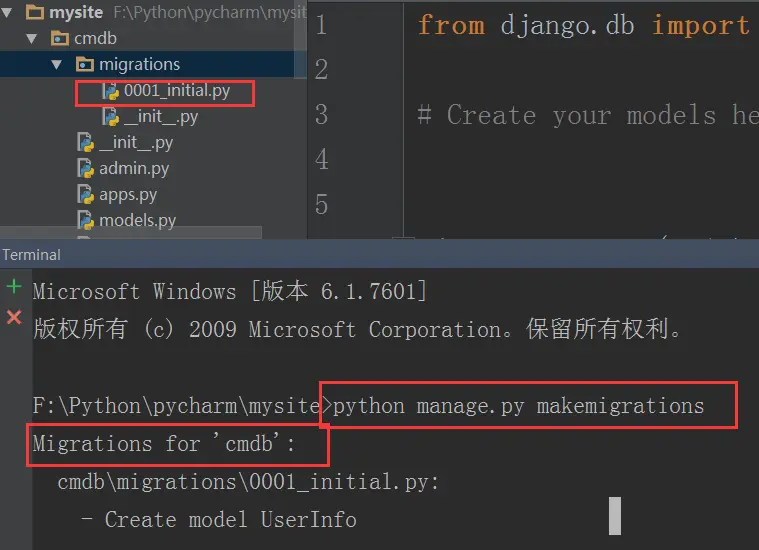 这样就创建了一个叫做cmdb的APP,django自动生成“cmdb”文件夹。