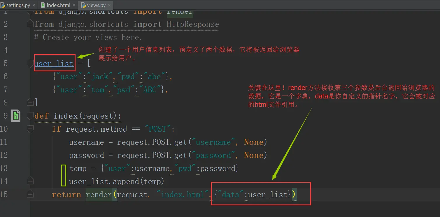 我们收到了用户的数据,但返回给用户的依然是个静态页面,通常我们会根据用户的数据,进行处理后在返回给用户。