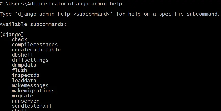 运行:django-admin help,能看到下面的内容表示OK。