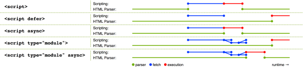 浏览器对于模块的加载默认是异步延迟进行的,即模块脚本的加载并不会阻塞浏览器的解析行为,而是并发加载并在页面加载完毕后进行解析,也就是所有的模块脚本具有 defer 属性。我们也可以为脚本添加 async 属性,即指明该脚本会在加载完毕后立刻执行。这一点与传统的非模块脚本相比很大不同,传统的脚本会阻塞浏览器解析直到抓取完毕,在抓取之后也会立刻进行执行操作。整个加载流程如下所示: