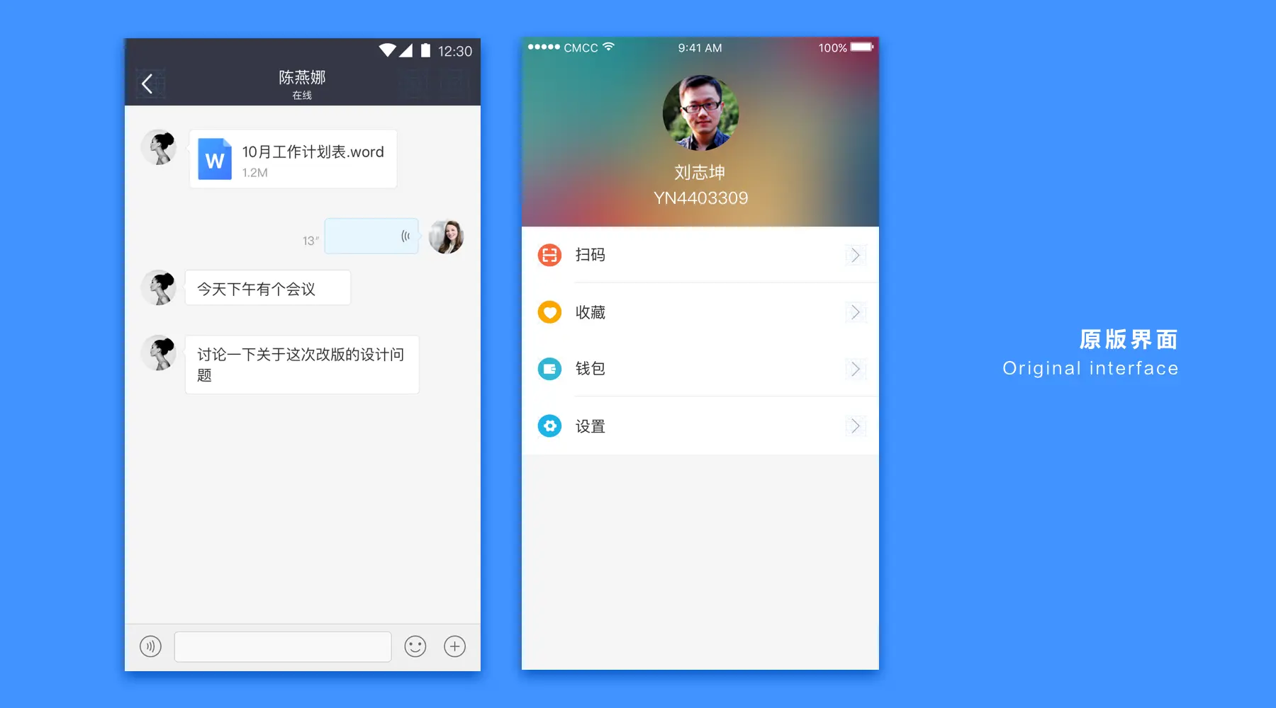 比如拿这两个页面来说,这是一款企业内部员工的即时通讯工具,产品定义是“方便员工高效沟通的即时通讯工具”。
