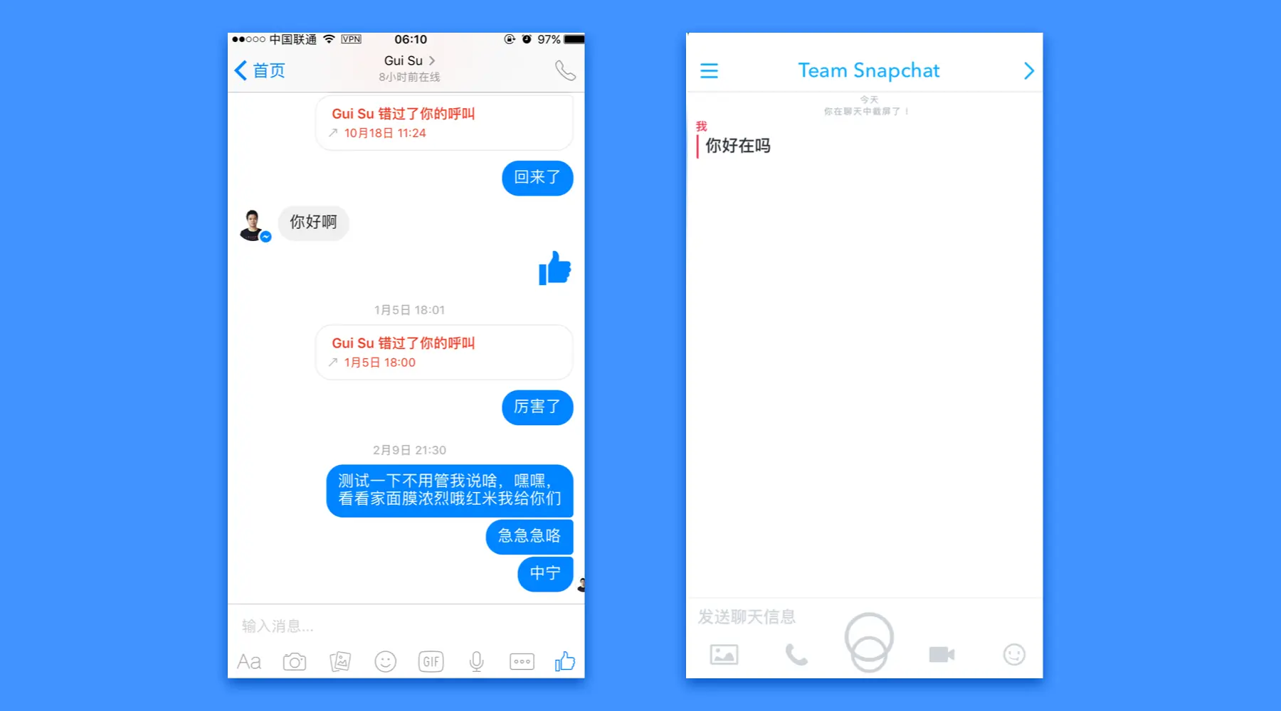 这里开始就要谈视觉了,首先你要和面试官强调,你是一个紧跟流行趋势的设计师,对于IM页面的改版,你寻找了很多国内外优秀的竞品,对它们进行分享与总结,如Facebook的Messenger、国际版QQ、Snapchat等等,截图如下: