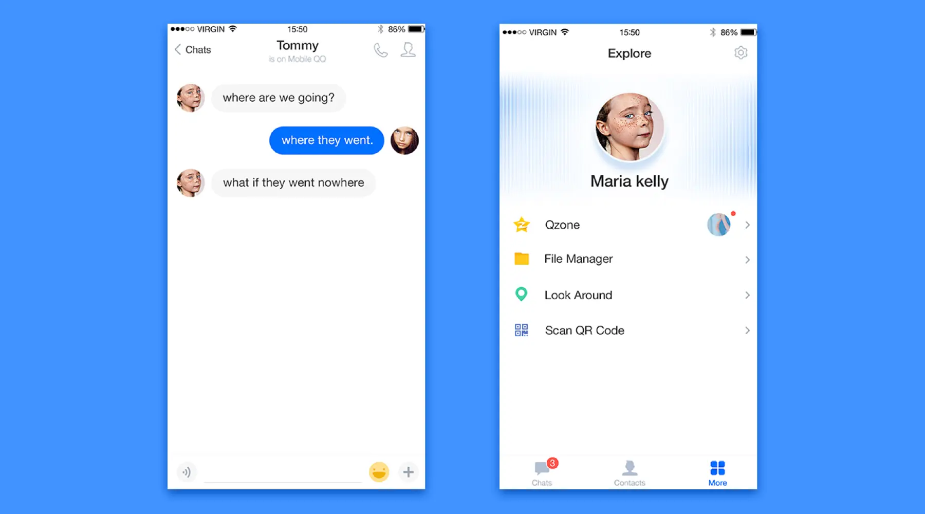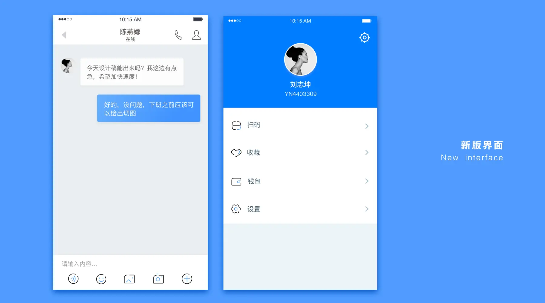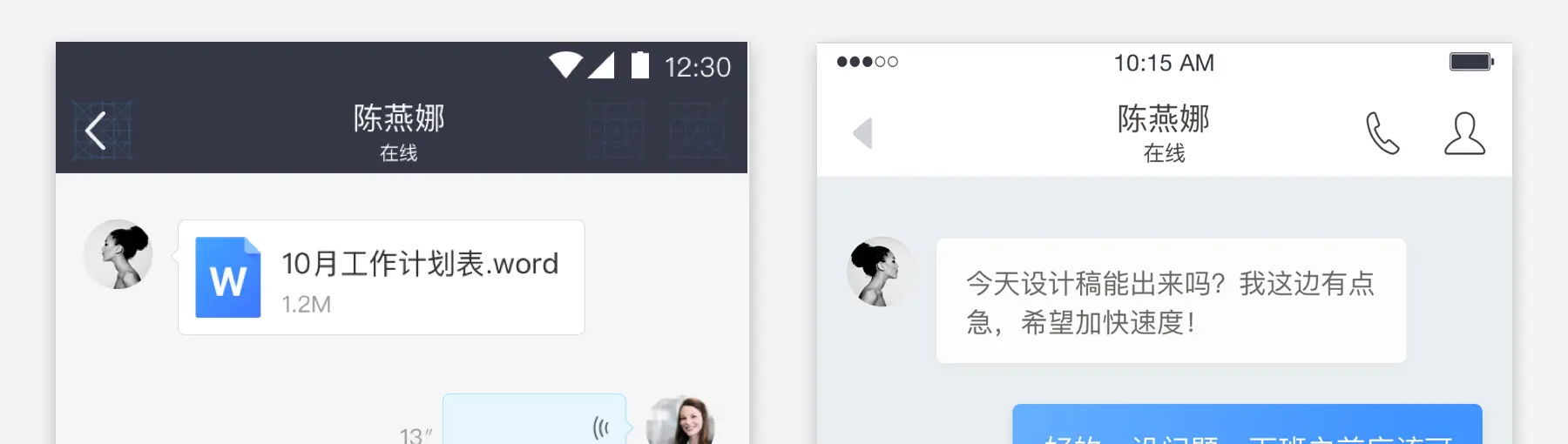 继续看上图,对话气泡采用渐变蓝色,使颜色更加通透,同时双方气泡颜色对比更加强烈,增加视觉上的耐看度,并且使用户更易区分哪些信息是自己发的,哪些是对方发的。