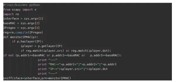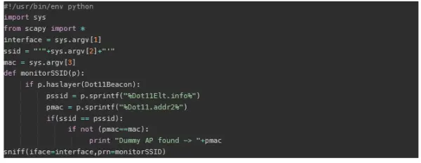 到目前为止,我们已经可以使用上⾯描述的⽅法构建⼊侵检测系统,并可⽤来监视⽆线流量。 您可以使⽤Scapy嗅探此流量,并 在其上构建脚本。 该脚本可以帮助跟踪⼊侵检测。
