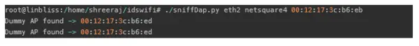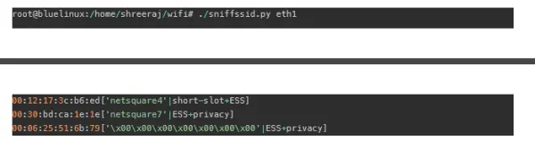 前⾯的脚本使⽤⼀个带有基地址和SSID的授权接⼊点,嗅探其信标包,同时使⽤不同的基本MAC寻找相同的 SSID。 该脚本报告任何和所有接⼊点,如下所⽰: