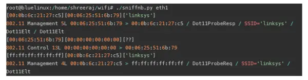 接⼊点被配置为以某种规则的间隔发射信标管理帧(emit beacon management frames)。 这些帧包含关于SSID,MAC地址,时间戳等信息。⼀旦eth1 网卡处于监听模式,⼈们就可以开始访问信标帧。 您可以使⽤Scapy访获取些数据包,如下所⽰: