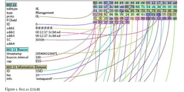 此帧可以帮助你确定关键信息,如接⼊点的MAC地址,SSID和WEP⽀持情况。 您可以为所有不同的Dot11数据包 和帧构建⼀个相同的视图。 该视图对学习802.11标准有很⼤的帮助.