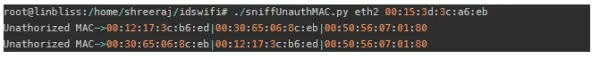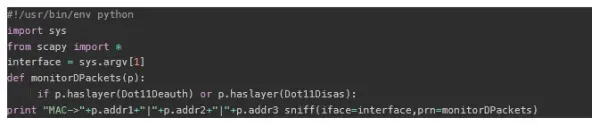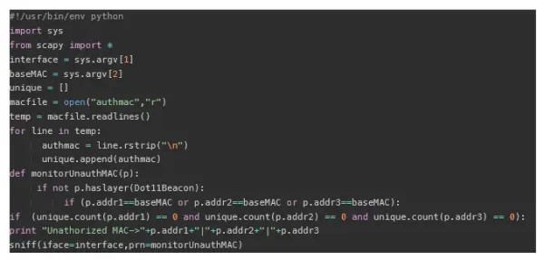从未经授权的MAC地址来的解密和解除分组包可以清楚地表明这是⼀个攻击⽹络的⾏为。 他们可能会是拒绝服务 (DoS)或中间⼈(man-in-the-middle)攻击。 以下脚本可以报告这些数据包,并附有MAC地址。 如果接⼊点未重 新启动,并且这些数据包是可观察的,则有⼈可能会在客户端注⼊这些数据包。