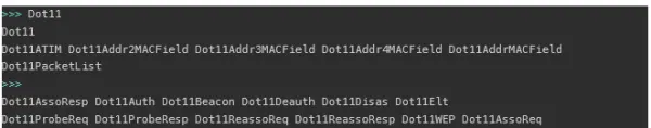 您可以嗅探⾮信标数据包,并尝试确定隐藏的接⼊点或隐藏的SSID。 管理帧的探测和关联会显⽰这些值。 Scapy 还⽀持⼏个层,如下所⽰: