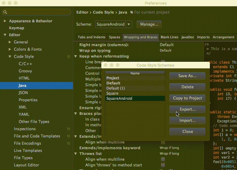 Preferences → Code Style → Java → Scheme选择