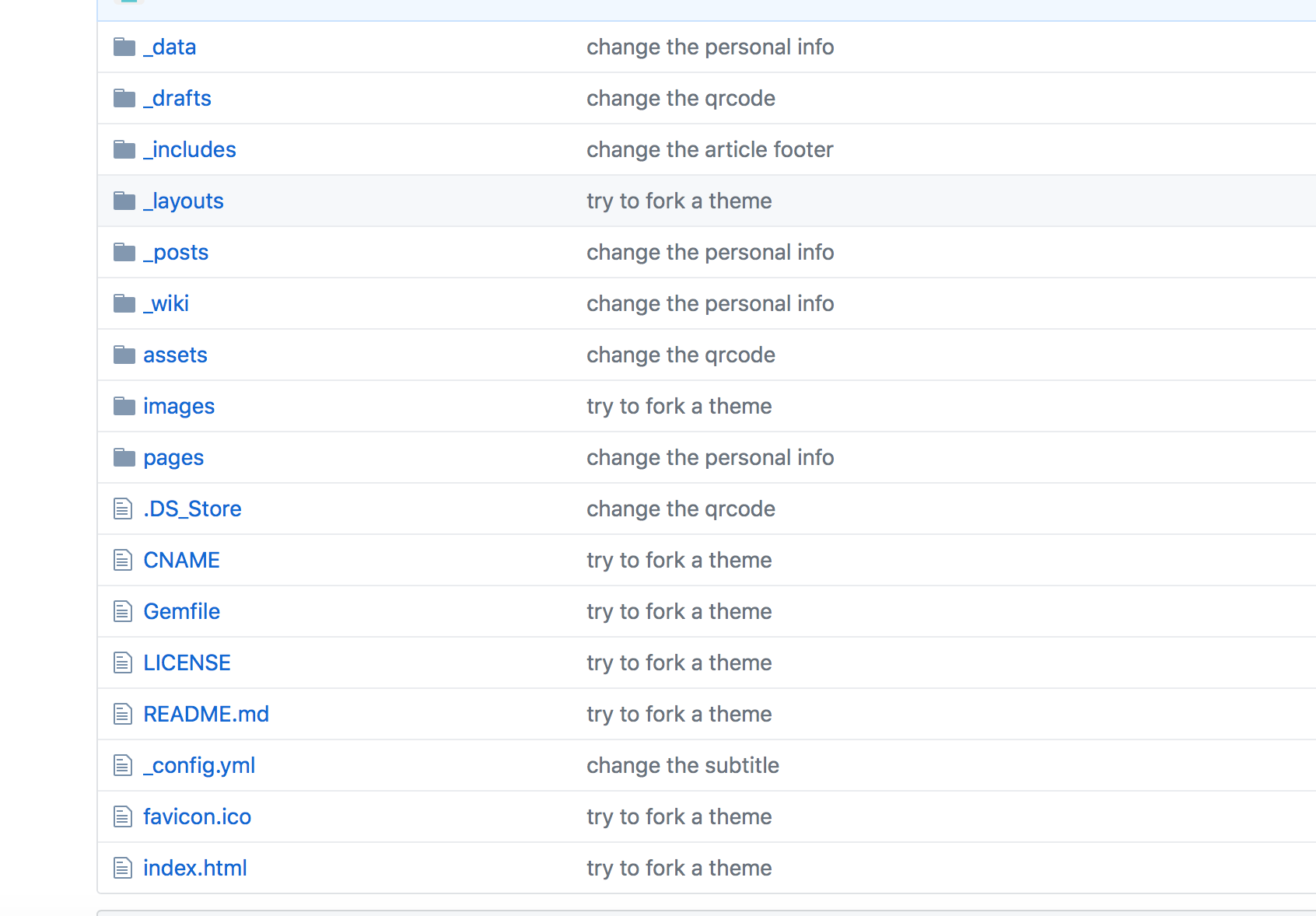 看看我上传后的源代码。学过web的人都知道入口就是index.html啦。我这个源代码是fork别人的代码,然后改动一下来的。改改标题啊,二维码啊啥的。原作者的文章我都还没有删除,先留着以后参考着markdown语法写文章。