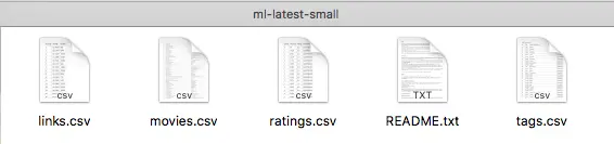 数据集使用上篇提到的Movielens电影评分数据里的ml-latest-small数据集,下载完成后有下面四个csv文件。