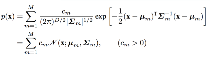 上面说的只是普通的高斯分布,还有混合高斯分布,不同于高斯分布的单模态性质M=1,混合高斯分布是多模态的M>1,是多个高斯分布的按权叠加,如下式: