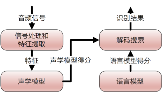 这里我们只关注语音识别系统,语音识别系统主要由四部分组成:信号处理和特征提取、声学模型(AM)、语言模型(LM)和解码搜索部分。如下图: