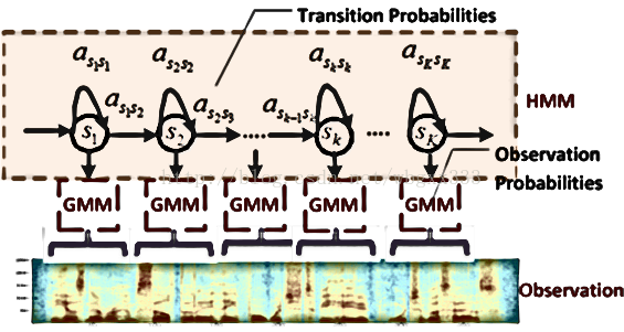 从图中可以看到,就像上文所说的,HMM中的状态序列就是语音识别的结果词汇序列,每种状态对应一种GMM,根据这个GMM可以得到该状态生成不同语音特征向量的概率。