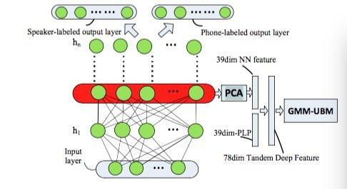 还有文献提出,要使用瓶颈隐层(隐层节点个数比其他隐层的少)的输出作为特征的方法来代替直接使用神经网络的输出特征向量。因为隐层的大小的选择是独立于输出层大小的,这个方法提供了训练目标维度和扩展的特征维度之间的灵活性。而且瓶颈隐层在网络中建立了一个限制,将用于分类的相关信息压缩成一个低维度的表示。