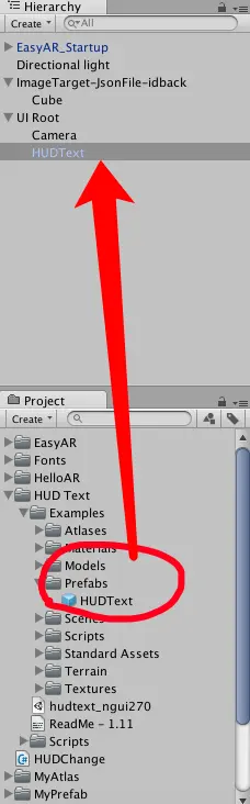 然后,导入HUDText插件资源。接着我们打开HelloAR自带的那个scene,删掉多余的Imagetarget,留下一个,我们在此基础上进行开发。