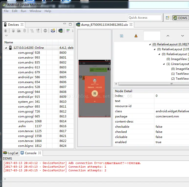 去年写过微信抢红包插件的实现,但春节的时候发现微信更新之后我的插件竟然会停在开红包的页面无法继续向下执行,debug之后发现问题是微信的开红包按钮现在被改成了图片,导致我使用findAccessibilityNodeInfosByText()找不到有效的子节点,也就无法实现模拟点击去打开红包。 于是乎我开始尝试通过获取控件ID去实现,迅速打开IDE,使用Android Device Monitor查看开红包按钮的控件id,后面会附上使用方法,然后使用findAccessibilityNodeInfosByViewId()来获取开红包按钮的节点,结果当然是可以的。 但是这就带来了另一个问题:如果每次微信发版后这个按钮控件的id发生变化,那插件也就只能跟随着修改代码才能正常使用。 针对这个问题我目前的做法是开一个ArrayList记录微信开红包button所使用过的id值,然后去遍历id值通过findAccessibilityNodeInfosByViewId()获取节点,当然用map存储id值及其对应微信版本号用来做版本兼容会更好些,谁让我懒呢,懒得去获取微信版本号。当然,还有种暴力的方法,就是遍历开红包页面的节点树并模拟点击其下的每一个能点击的button,因为其实界面里能点击的就只有关闭按钮和开红包按钮,但关闭按钮其实是个imageView而不是button。