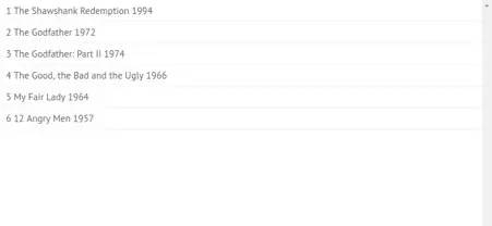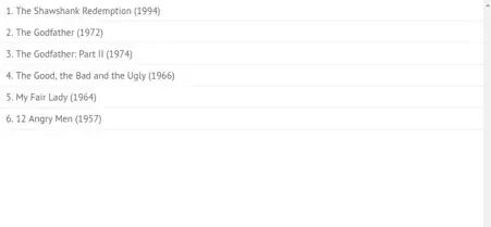 { id:6, title:"12 Angry Men", year:1957, votes:164558, rating:8.9, rank:6}