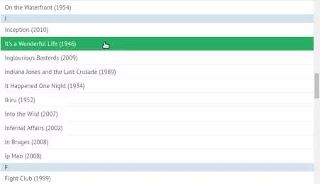 这看上去与我们的第一个例子非常相似。但是这里我们所使用的view属性值是“unitlist”,表示使用的是Unitlist部件而非基本列表部件。另一个重要的不同是unitBy属性,该属性用于根据指定条件对数据进行分组。在我们的例子中,使用标题中的第一个字母作为分组准则。