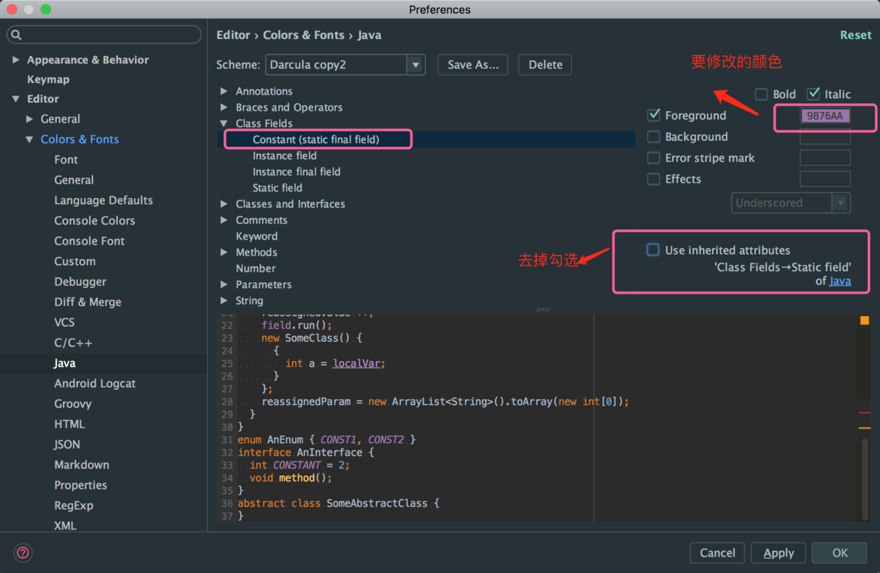 3,Scheme 下面有一个列表,如:Annotation、Class Fileds、Class And Interfaces 等等。点击一个项目,然后就可以在右侧修改对应显示的颜色了。