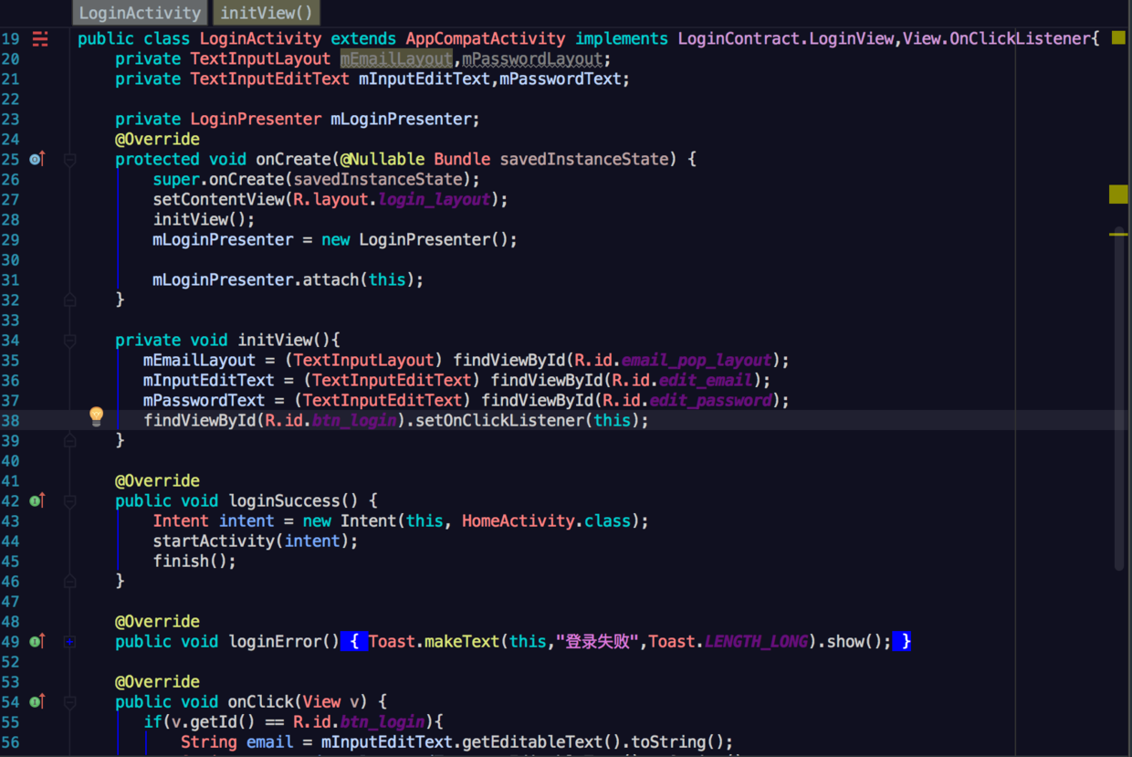 Android Studio 为我们内置了两款主题,黑色灰暗风格和白色高亮风格。刚从Eclipse 转到 Android Studio 那会儿,觉得很新鲜效果非常好,感觉敲代码都有劲。但是用的时间久了,感觉有点审美疲劳了。前几天用马克飞象写文章的时候,感觉在马克飞象上面的代码呈现效果非常赞(效果如下图),于是就想着能不能在Android Studio 上运用上这个效果。经过一翻探索,有几种方式都可以换上一些比较炫酷的主题,这篇文章就介绍一些这些花式换主题的方式。