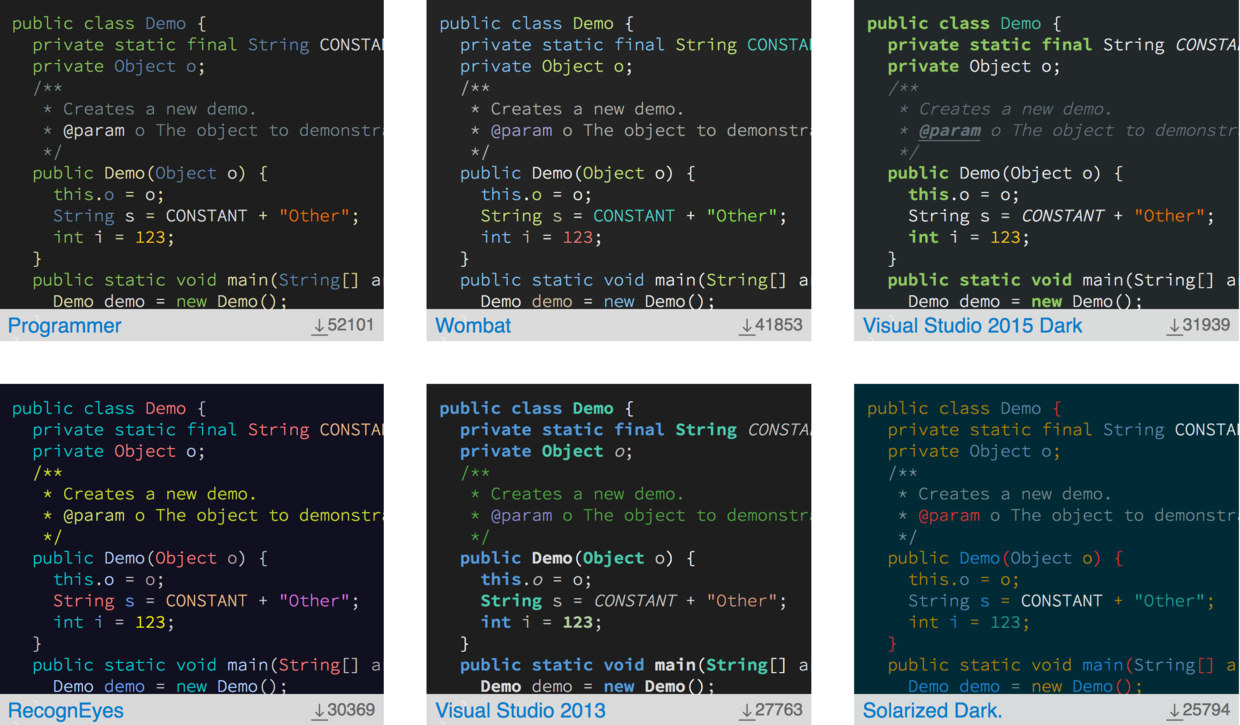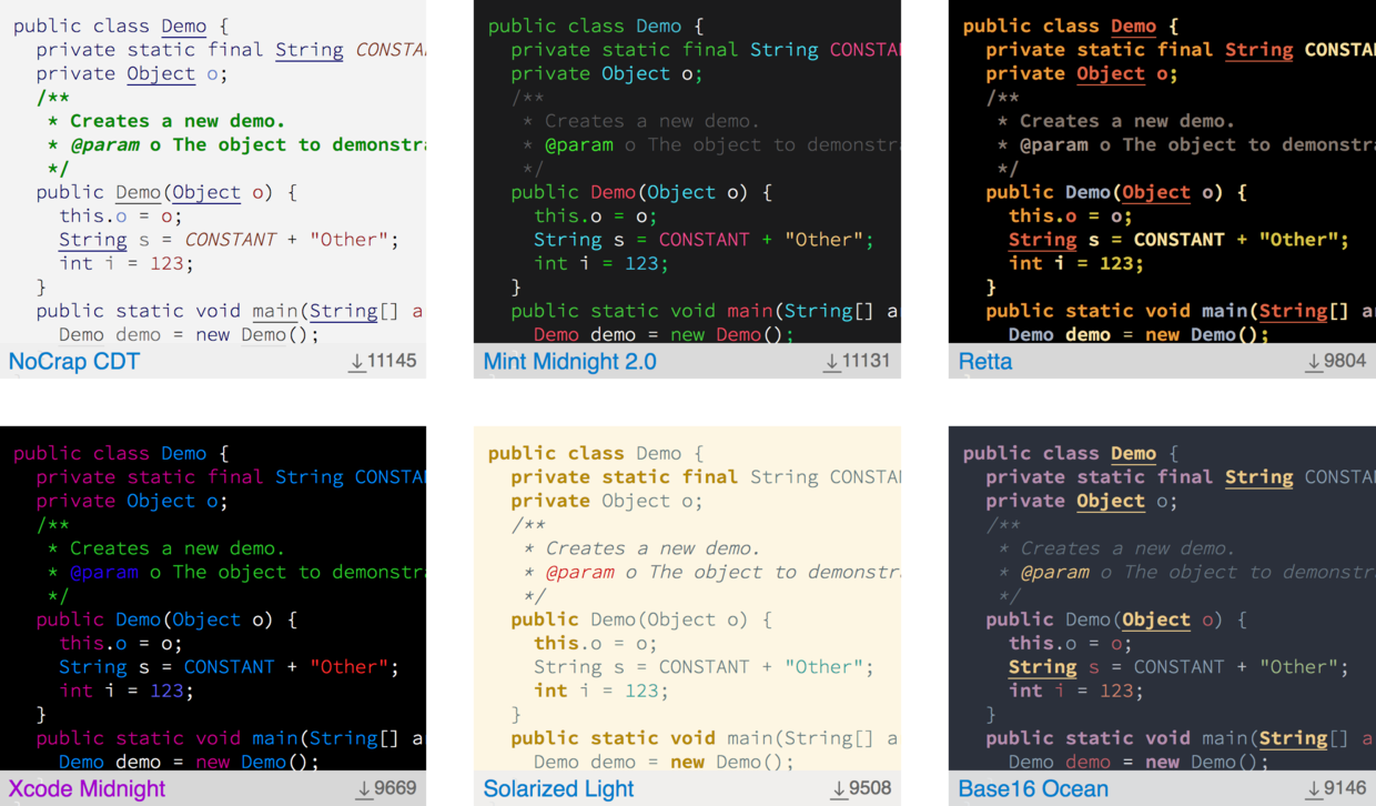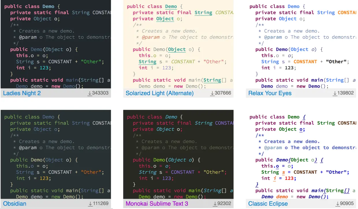 方式一虽然能够定制个性话的主题,但是很麻烦,那么有更简单的方法吗?Google 了一下,果然有惊喜,那就是这个网站 Color Theme ,网址Color Themes,上面提供了很多模版,选择一个你喜欢的下载,下载下来是一个jar 包,导入Android Studio 就可以使用了。看一下Color Themes 提供的这些主题模版: