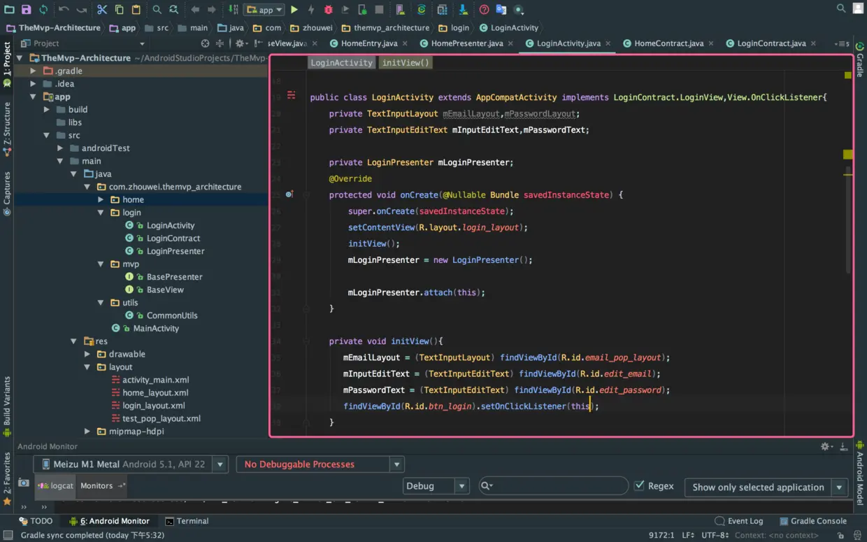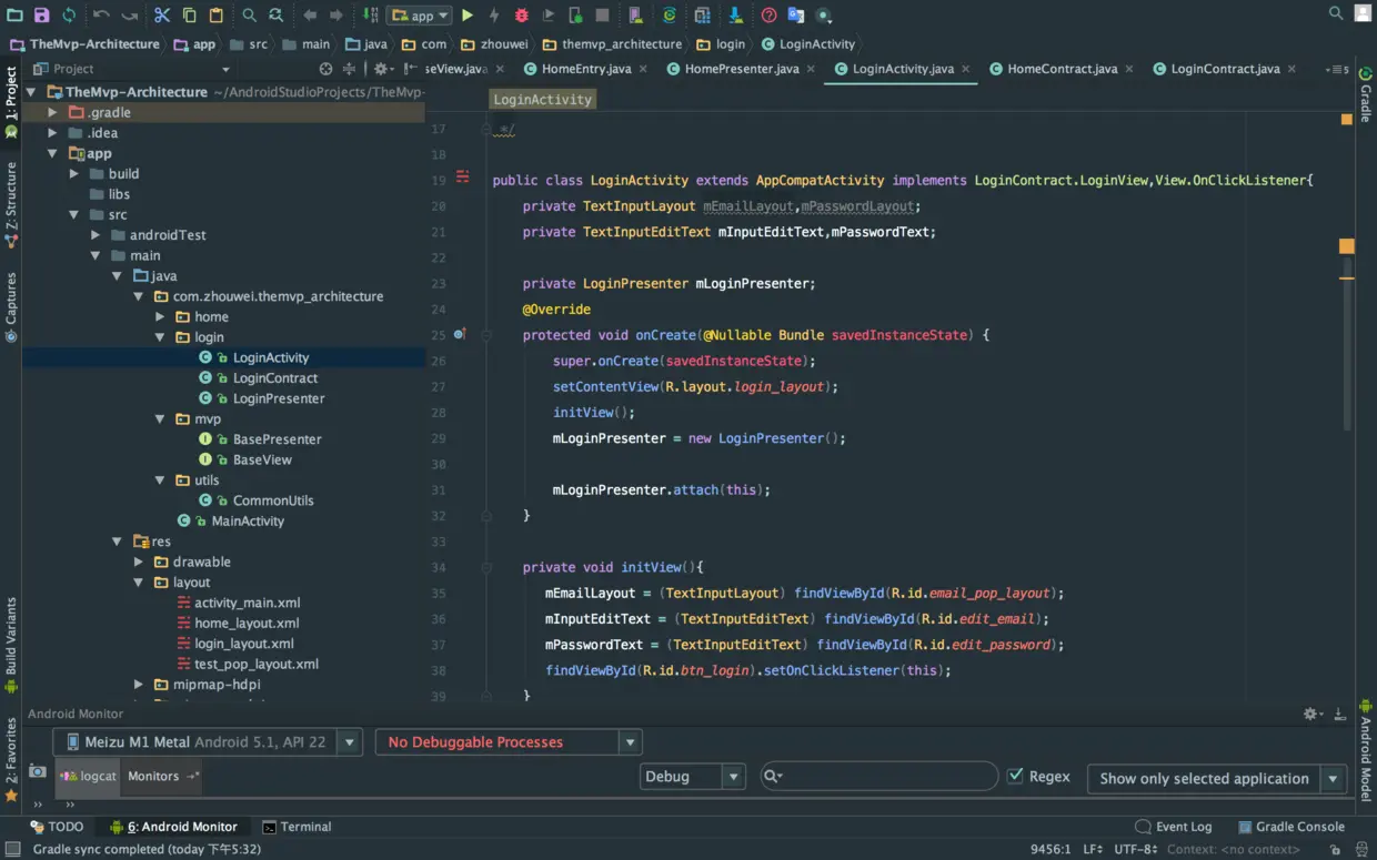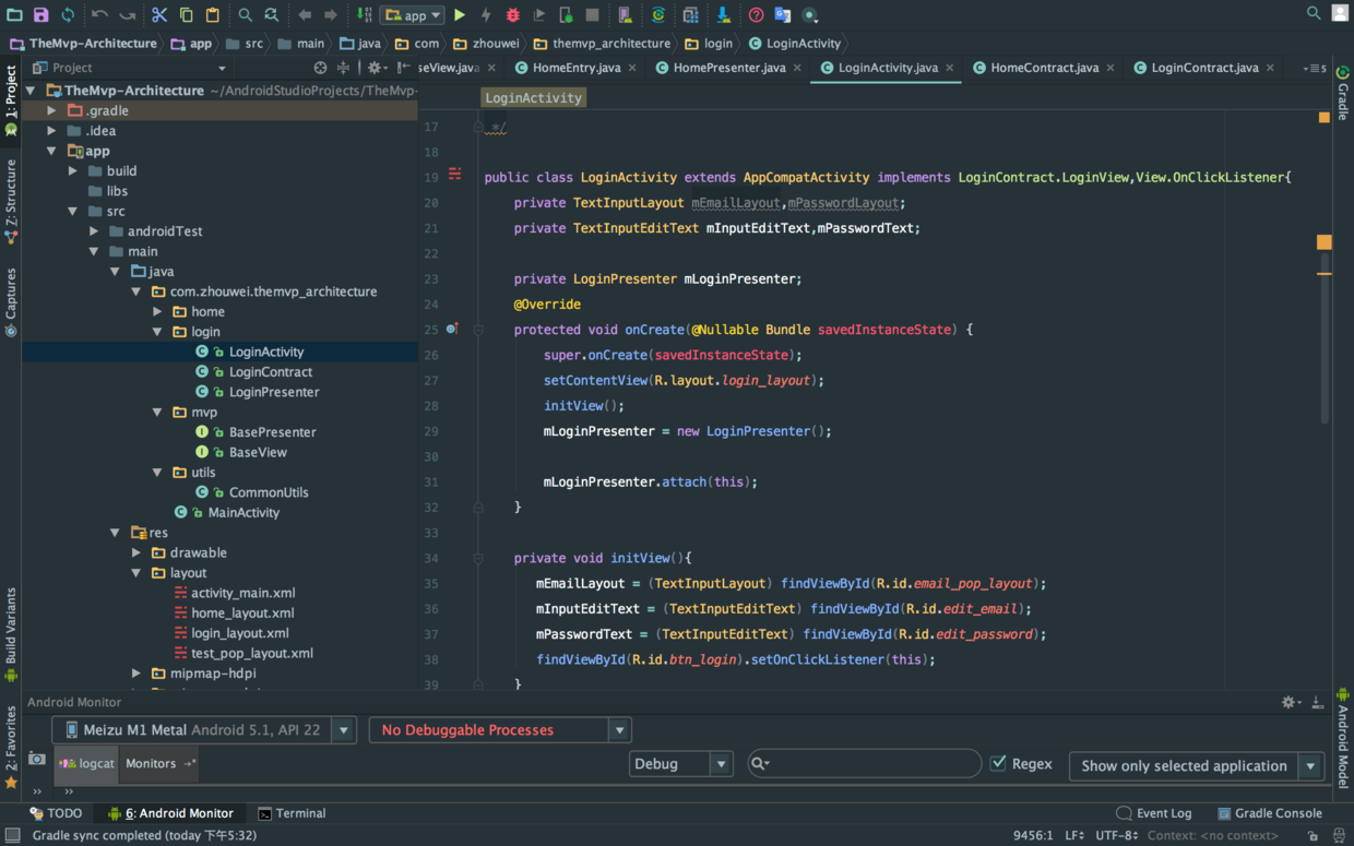 通过方式二,就能为Android Studio 应用一个自己喜欢的个性化主题,但是有一个缺点:这些主题只更改了代码编辑区域,左边的包结构区域和菜单栏还是和原来是一样的,看起来和整体风格好像不是很搭,那么有没有可以使整个AS的风格都改变的主题呢?通过Google ,找到了Material Theme UI,原文地址Making Android Studio pretty,Material Theme UI 是一个Android Studio 插件,它提供了三种主题供选择,效果非常不错,更赞的是,它连除了代码区域之外的风格也改变了,应用了Material Theme UI 主题的效果图如下:
