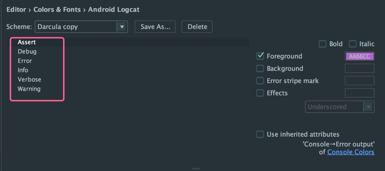(1) 在Android Studio 菜单栏 打开 Preferences -> Editer -> Colors & Fonts -> Android Logcat