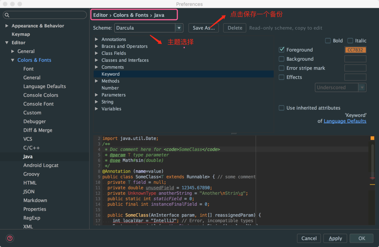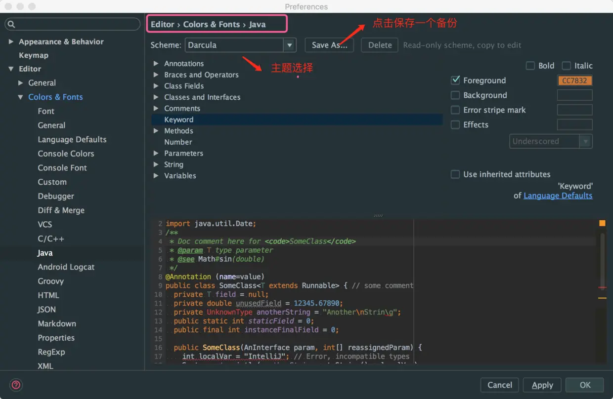 1,进入设置页面的Colors & Fonts 下:Preferences -> Editer -> Colors & Fonts -> Java